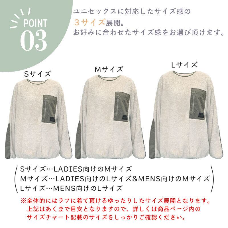 もこもこのボア素材に、異素材の配色布帛をポケットと肘パッチに大胆に切り替えたデザインがポイント。