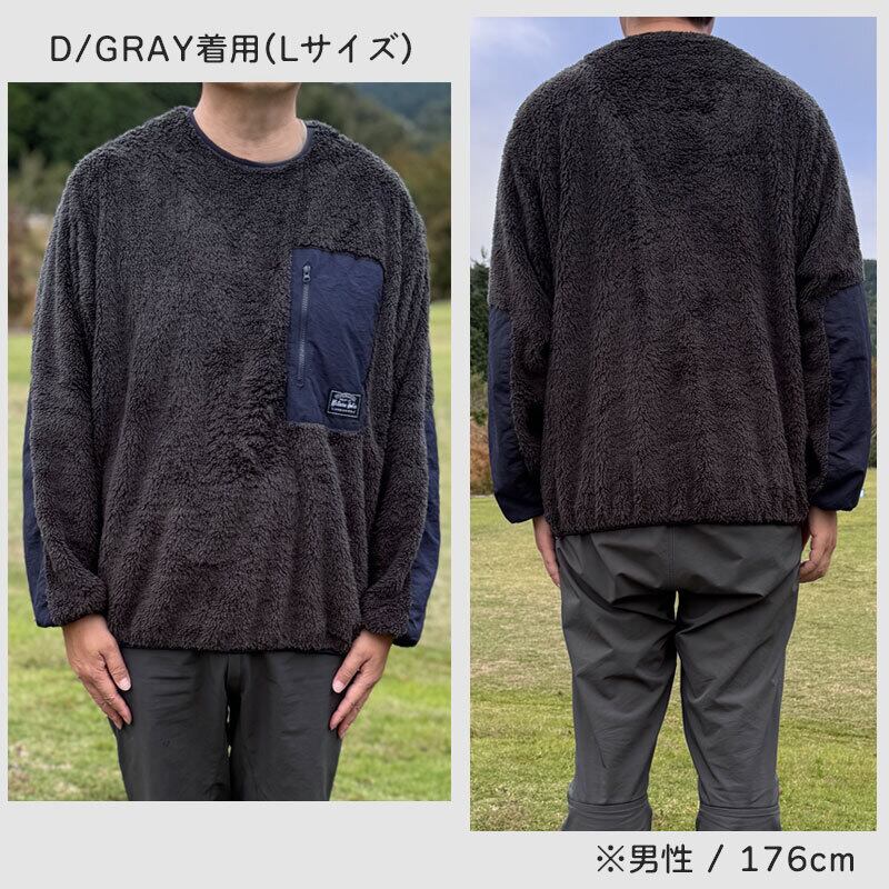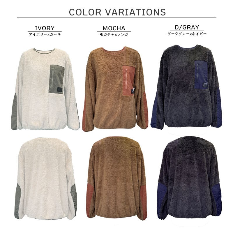 キャンプやアウトドアシーンにぴったりな、配色切り替えのボアフリースプルオーバー。